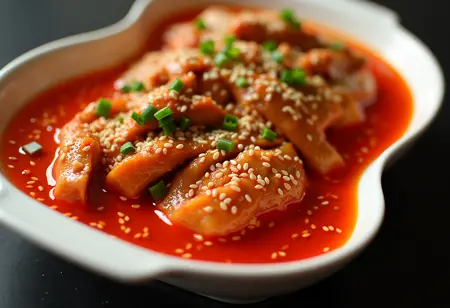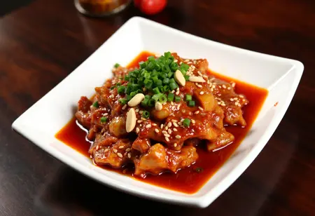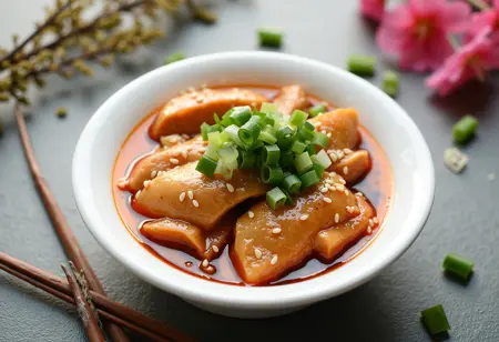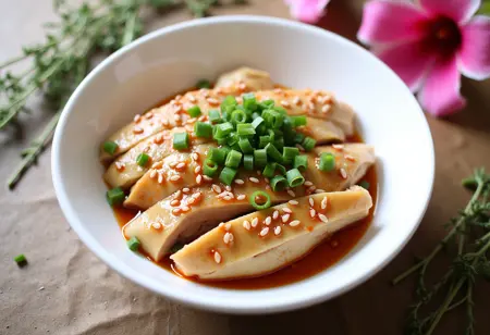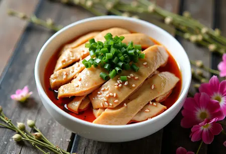 一个中餐LoRA,蒸鸡配辣椒酱,中文拼音:“kou shui ji”。需要注意的是,这道菜实际上并不含唾液。这是一个中文成语,用于夸张地形容菜肴美味诱人,字面意思是这道菜香气扑鼻、令人垂涎欲滴。