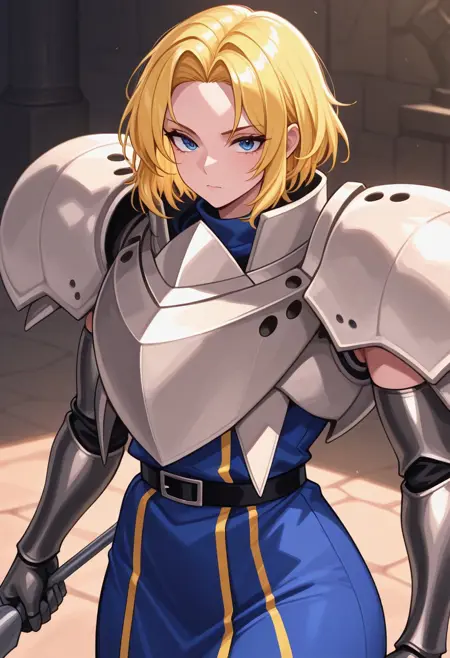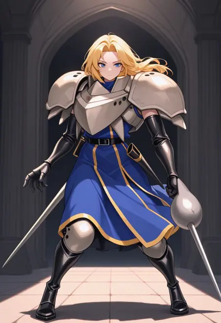 Charlottess, solo, armor, blonde hair, 1girl, weapon, blue eyes, gauntlets, boots, shoulder armor, polearm, dress, pauldrons, breastplate, long hair