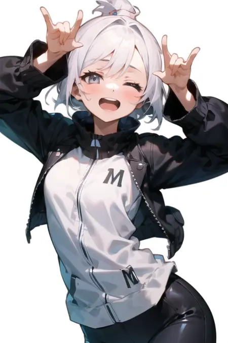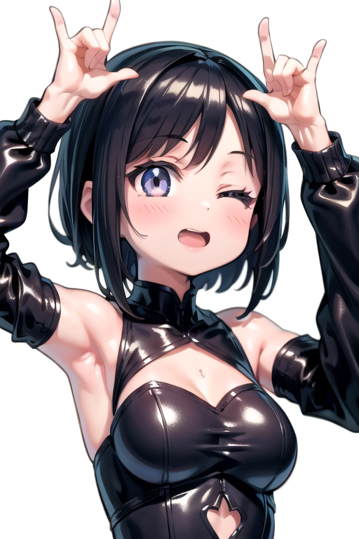片目を閉じている、口を開けている、観察者を見つめている、笑顔、頬が赤い、