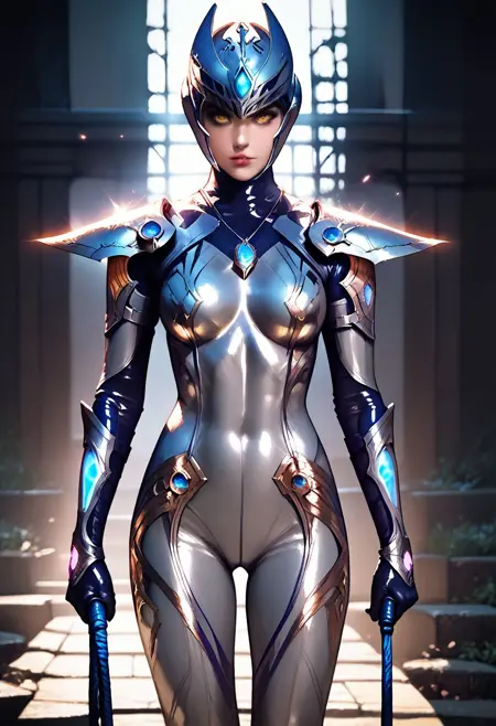 Ultraman form:1girl,Carmeara,armor,bodysuit,silver tights,yellow eyes, helmet, gold and silver bodysuit, blue gem,high heels,necklace,bangs,ultraman,tokusatsu,
