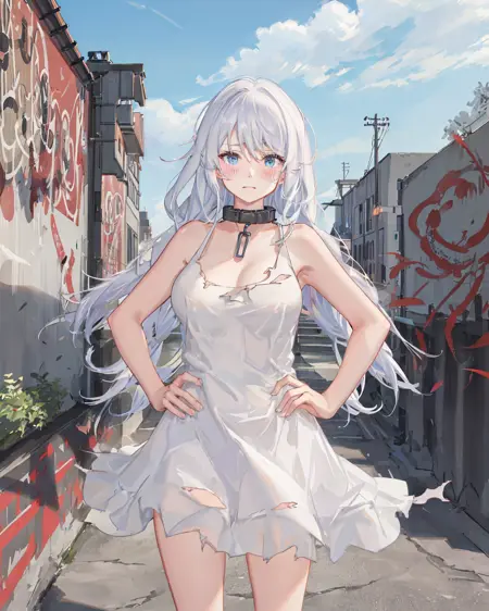 おすすめプロムプト(推奨プロンプト): 手錠、足かせ……白髪、長い髪、破れたドレス……