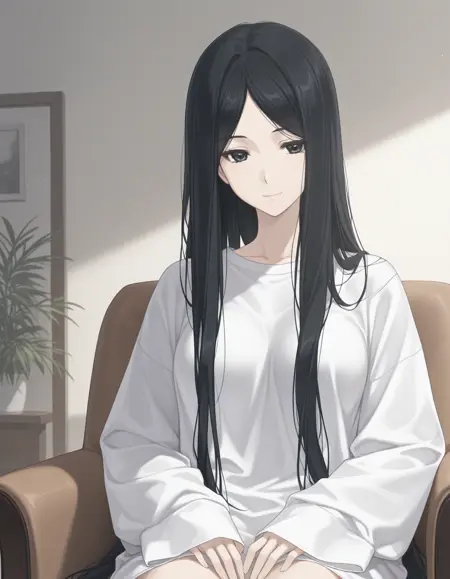 satsuki_IG, black hair, very long hair, parted bangs, black eyes, pink kimono, floral print, sash