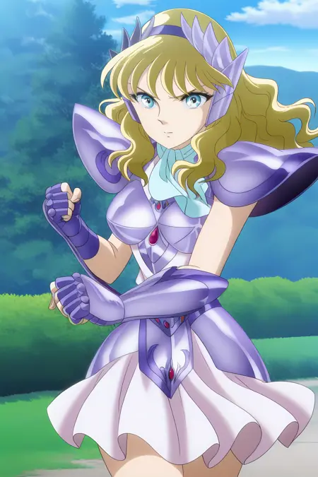 Mii, 1girl, solo, long hair, blonde hair, blue eyes,, Delphinus Armor, Delphinus Helmet, skirt, armor, gloves, fingerless gloves,