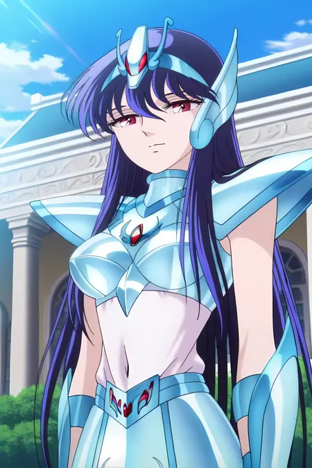 Kyouko, 1girl, solo,  long hair, red eyes, blue hair,, Equuleus Armor, Equuleus Helmet, long hair, gloves, midriff, armor,