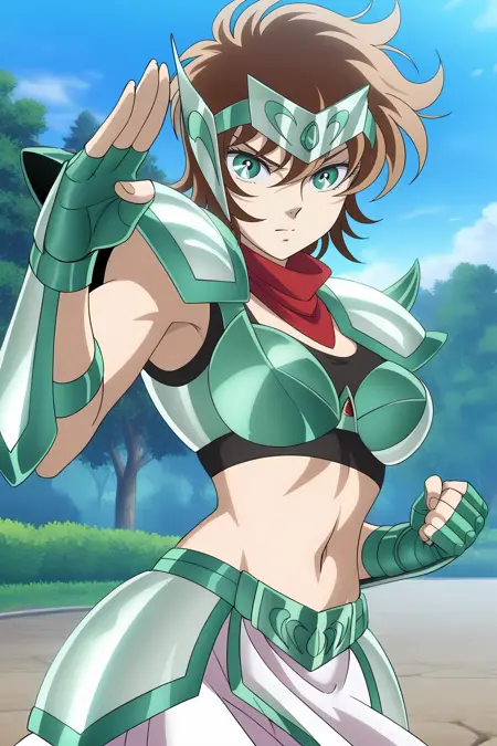 Cassiopeia Erda, 1girl, solo, green eyes, breasts, short hair, brown hair,, Cassiopeia Armor, Cassiopeia Helmet, gloves, navel, midriff, fingerless gloves, armor,