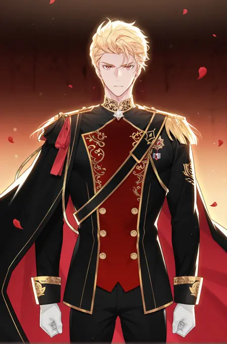 Black Clothes: black_clothes, white gloves, black cape, long sleeves, epaulettes, petals, black and red suit, military uniform, black pants