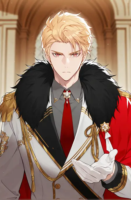 Default Clothes: default_clothes, white gloves, red cape, aiguillete, formal, (black fur trim), long sleeves, white pants, white boots, grey shirts, red necktie