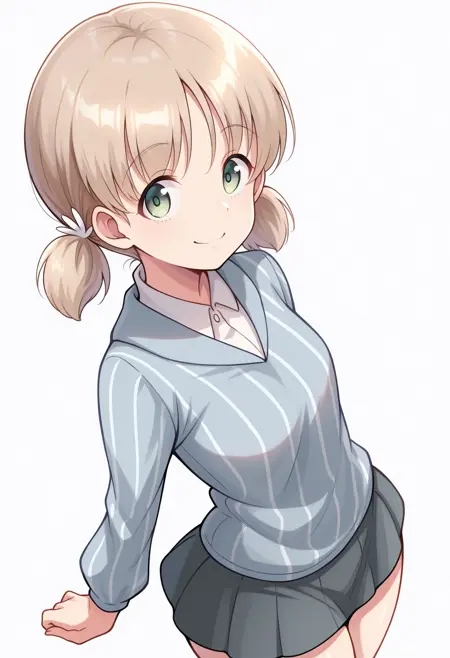 1girl, 短双马尾, 浅棕色头发, 绿色眼睛, 微笑, 发圈, keizoku 校服, 竖条纹衣物, 竖条纹衬衫, 衬衫, 白色衬衫, 迷你裙