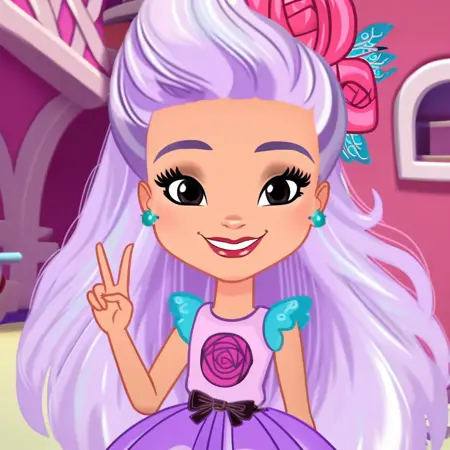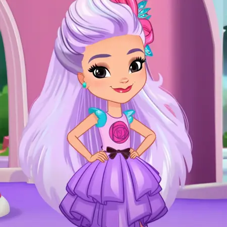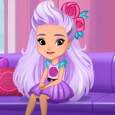 blair_sd, purple hair, long hair, hair flower, earrings, purple dress