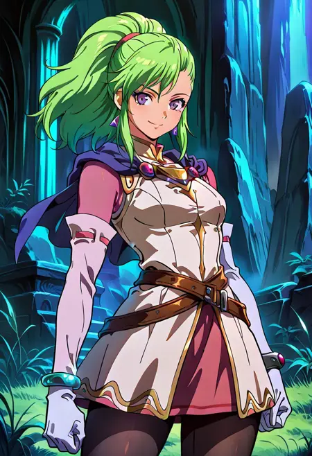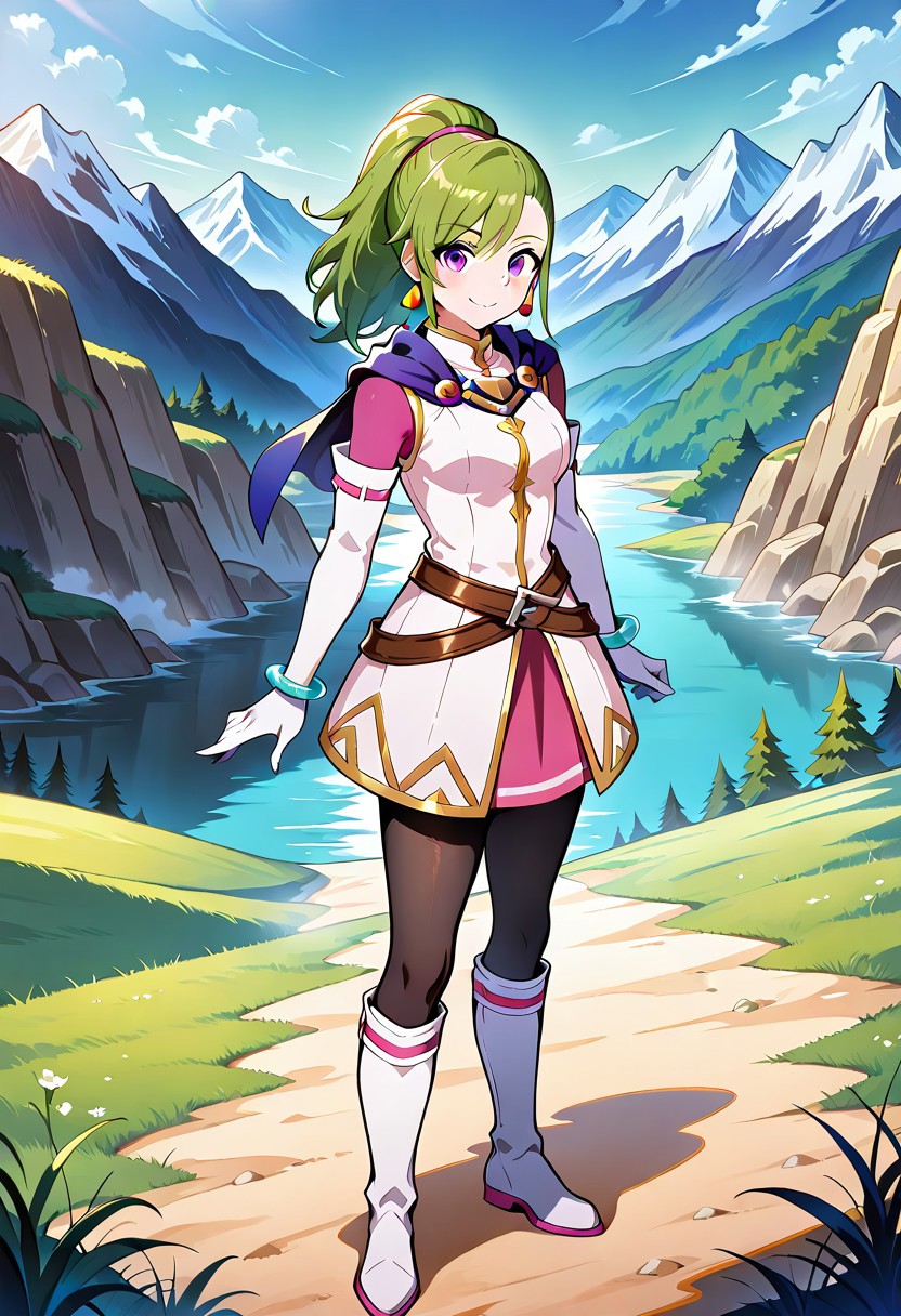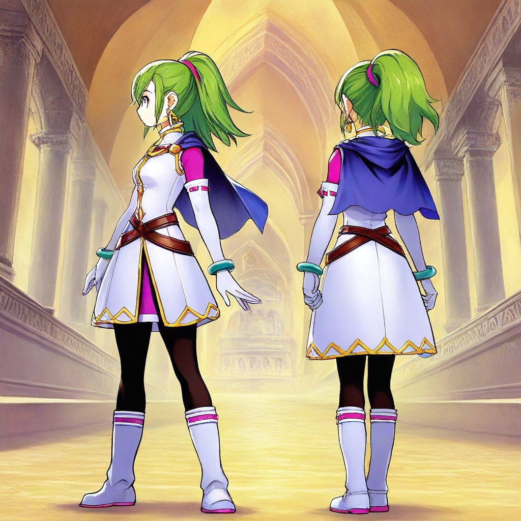 プロンプト: 緑の髪、ポニーテール、前髪、非対称な髪型、サイドロックス、紫の目、三角形のイヤリング、カーペット、青いカーペット、小さい胸、マンダリンカラー、コート、白いコート、リボンの縁取り、金の縁取り、アンダーシャツ、ピンクのシャツ、ピンクの袖、クロスベルト、ミニスカート、ピンクのスカート、白い手袋、エルボーグローブ、ブレスレット、黒いパンティストッキング、白いブーツ、膝上ブーツ
