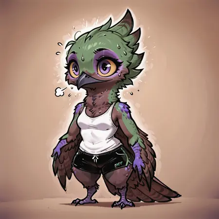 正面 - 绿色头部,黄色眼白,紫色喙,绿色肩膀,羽毛手臂,鹰身手臂,棕色大腿,紫色斑点,健美体型,肌肉(可选)