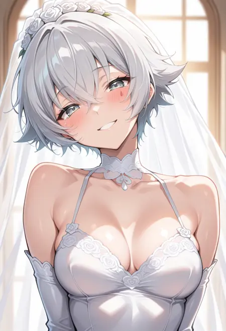 灰色の目、灰色の髪、短髪、涙滴状の顔の模様、中程度の胸、