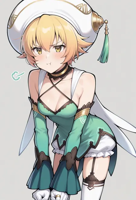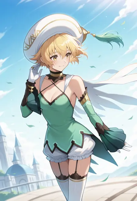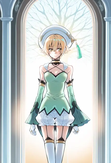 ベレー帽、白い頭飾り、帽子の房、緑の房、白いカーディガン、チョーカー、クロスハーネス、ハーネスネック、胸元、肩出し、緑のドレス、外れ袖、緑の袖、長袖、白い手袋、ジュエリー、指輪、フリル、白いブローマーズ、絶対領域、ガーター straps、白い靴、太ももブーツ、ハイヒール、
