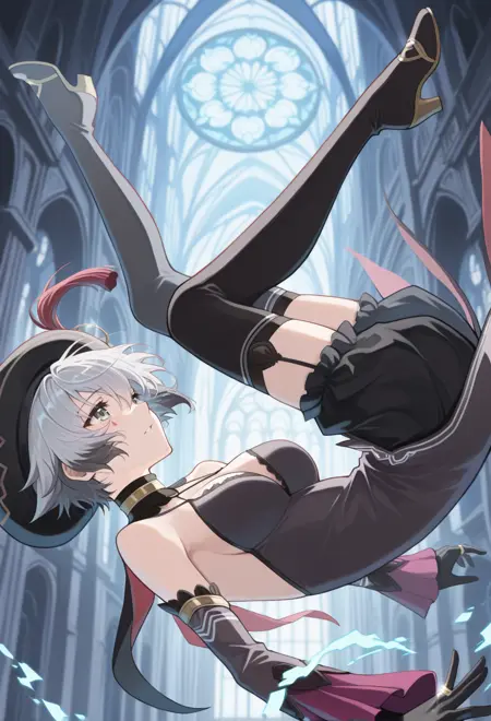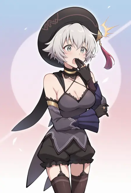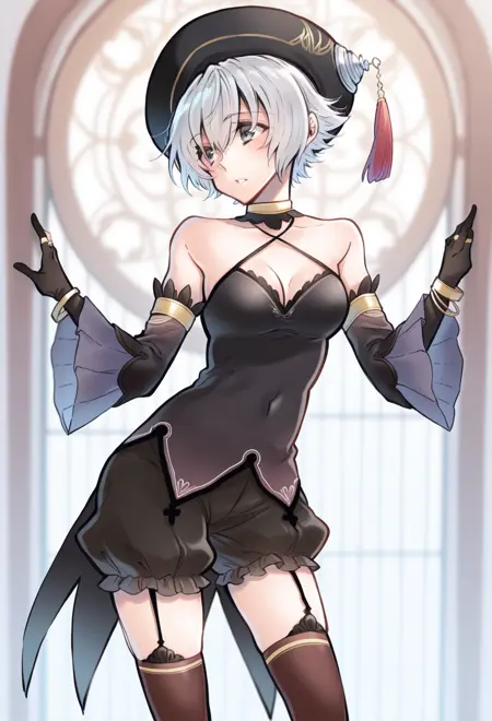 ベレー帽、黒い頭飾り、帽子の房、赤い房、黒いカーディガン、チョーカー、ハーネスネック、クロスハーネス、黒いドレス、胸元、肩出し、外れ袖、黒い袖、長袖、フリル、黒い手袋、ジュエリー、指輪、黒いブローマーズ、絶対領域、ガーター straps、太ももブーツ、黒い靴、ハイヒール、