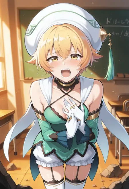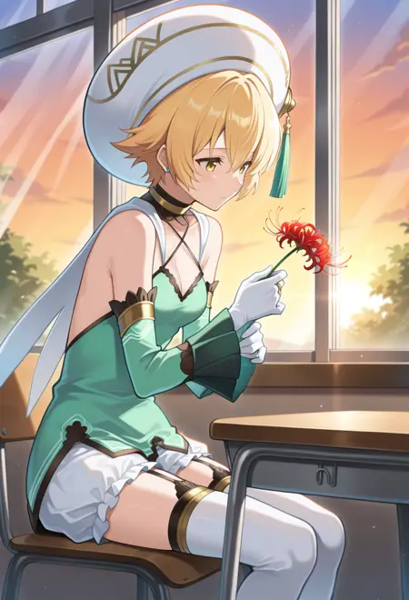 베레모, 흰색 머리장식, 모자 달, 녹색 달, 흰색 망토, 목걸이, 십자형 허리끈, 허리끈, 가슴선, 어깨 노출, 녹색 드레스, 분리된 소매, 녹색 소매, 긴 소매, 흰색 장갑, 보석, 반지, 프릴, 흰색 블루머, 젯타이 루이키, 스타킹 고정 끈, 흰색 신발, 허벅지 부츠, 하이힐,