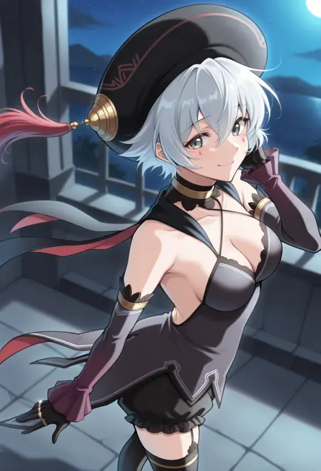 베레모, 검은색 머리장식, 모자 달, 빨간색 달, 검은색 망토, 목걸이, 허리끈, 십자형 허리끈, 검은색 드레스, 가슴선, 어깨 노출, 분리된 소매, 검은색 소매, 긴 소매, 프릴, 검은색 장갑, 보석, 반지, 검은색 블루머, 젯타이 루이키, 스타킹 고정 끈, 허벅지 부츠, 검은색 신발, 하이힐,