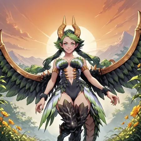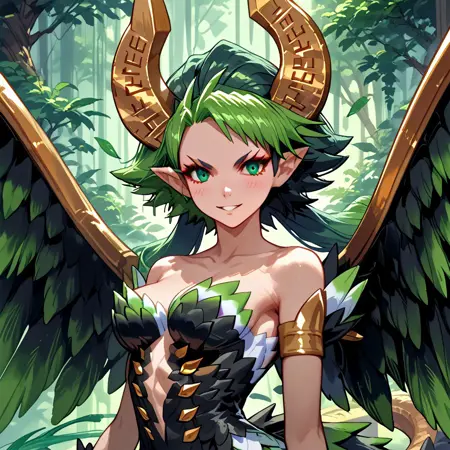 Trigger words: Garuda Dragalia, black and green hair, short hair, green eyes, horns, large breasts, wings, harpy, feathers, wide hips, tail, thigh boots, high heel boots