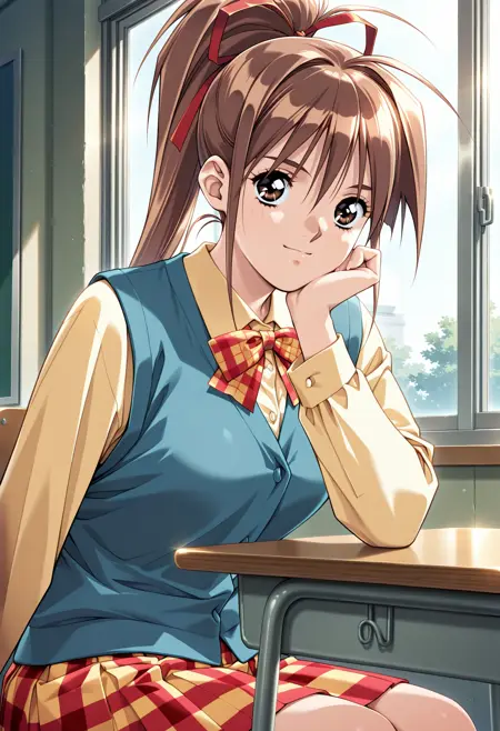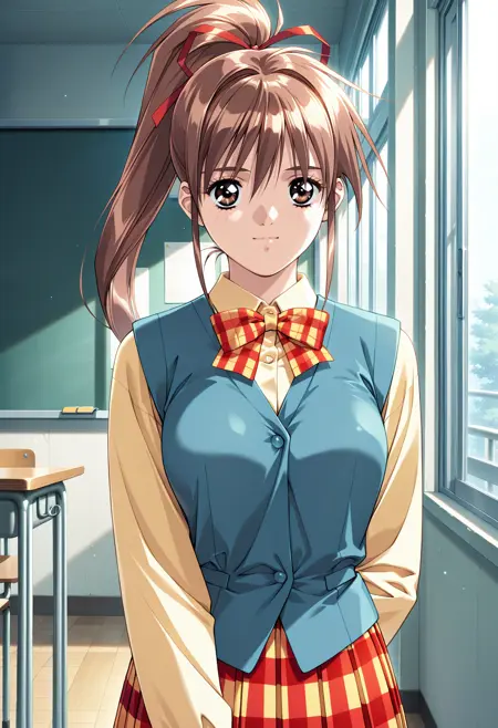 学校制服:nanpamisa、レトロアートスタイル、1girl、solo、ハイポニテール、ヘアリボン、茶色の髪、長い髪、ヘアリボン、額に髪がかかる、サイドロックス、茶色の目、まつ毛、d2学校制服、チェック柄ボウタイ、青いベスト、黄色のシャツ、プリーツスカート、チェック柄スカート、長い袖、リボン、赤いリボン、シャツ collar、中程度の胸