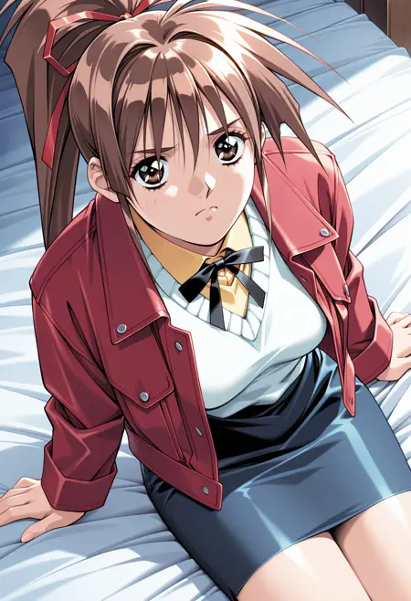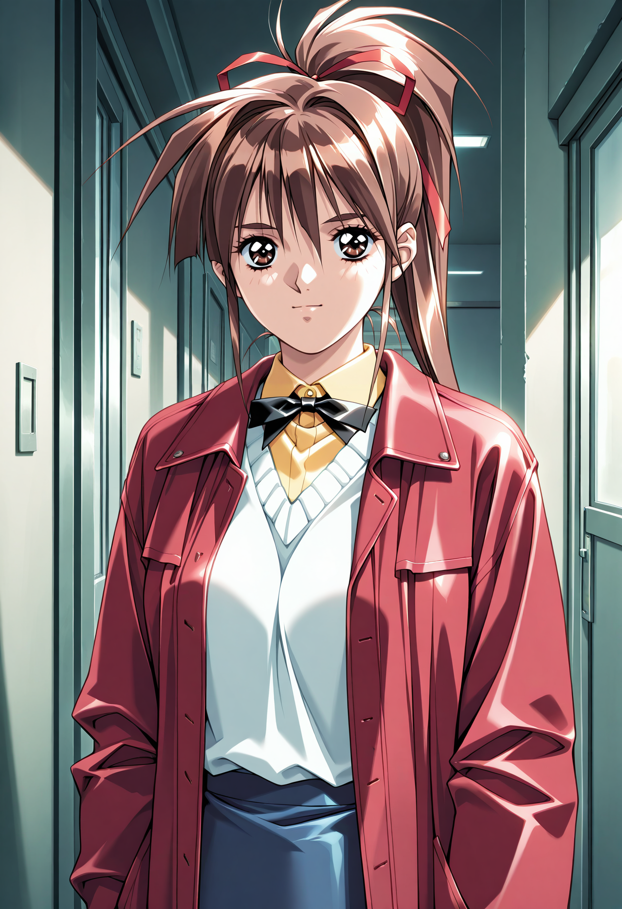 ベース:nanpamisa、レトロアートスタイル、1girl、solo、ハイポニテール、ヘアリボン、茶色の髪、長い髪、ヘアリボン、額に髪がかかる、サイドロックス、茶色の目、まつ毛、赤いジャケット、開いたジャケット、黄色のシャツ、黒いM2ボウタイ、長い袖、白いセーター、鉛筆スカート、青いスカート、リボン、中程度の胸