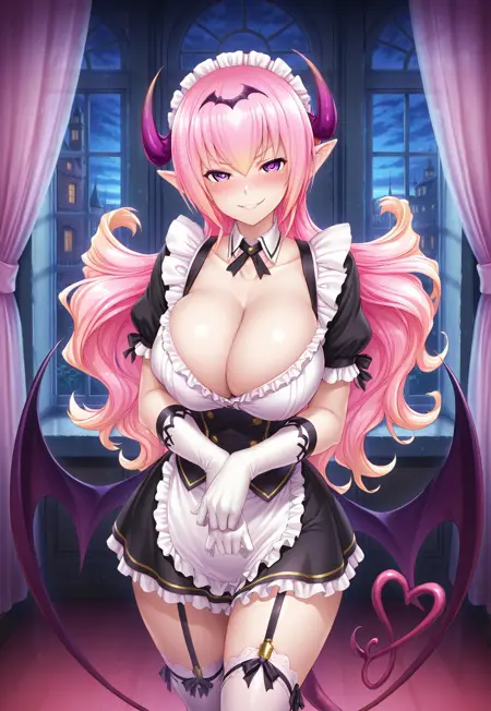 タグ:ミレーユ、長い髪、ピンクの髪、尖った耳、紫の目、大きな胸、曲線美、サキュバス、悪魔の少女、悪魔の角、悪魔の翼、悪魔の尾