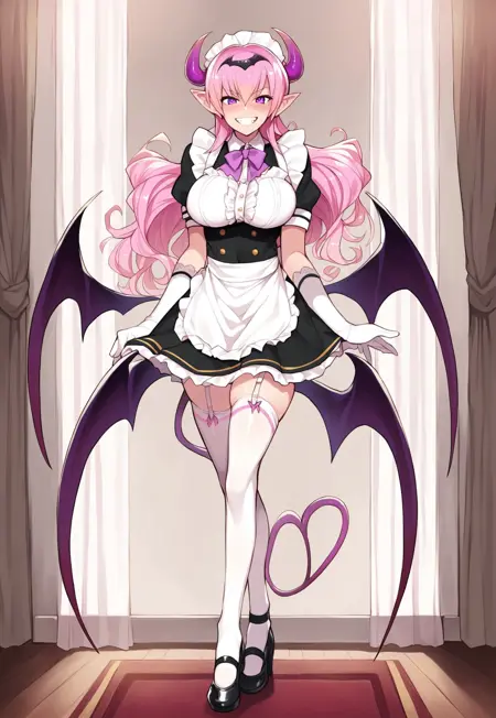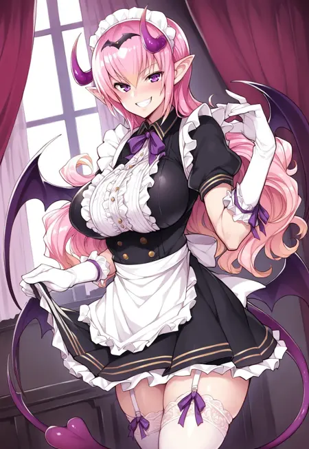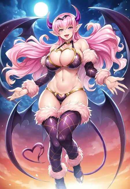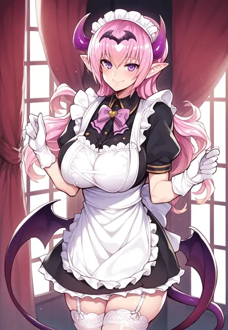 Tags: Mireille, long hair, pink hair, pointed ears, purple eyes, large breasts, curvy, succubus, demon girl, demon horns, demon wings, demon tail