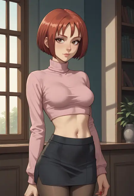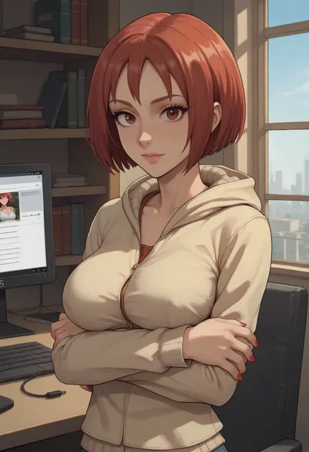 推荐标签:1girl,solo,棕色眼睛,短发,红发,乳房,中等大小乳房,妆容