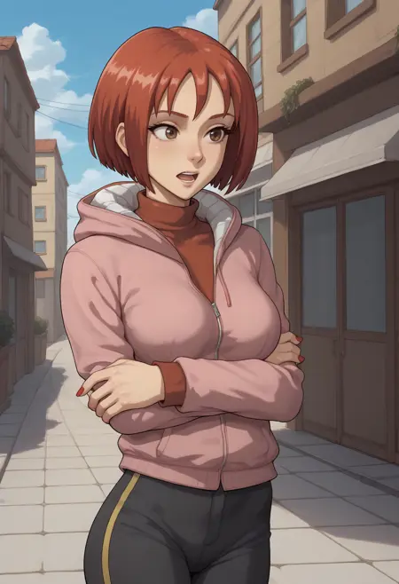 권장 태그: 1girl, solo, 갈색 눈, 단발, 붉은 머리, 가슴, 중간 크기 가슴, 메이크업,