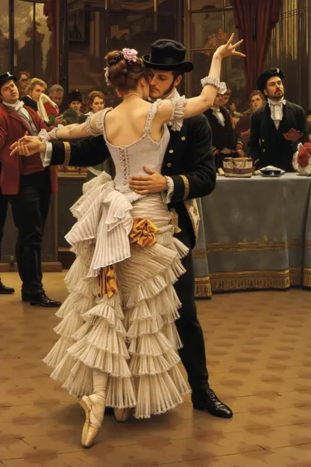 티소의 작품은 사실적인 세부 묘사와 화려함을 결합하여 상류사회의 패션과 배경을 사진처럼 정확하게 포착함