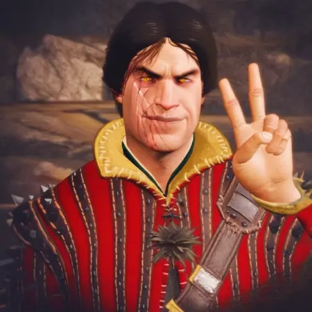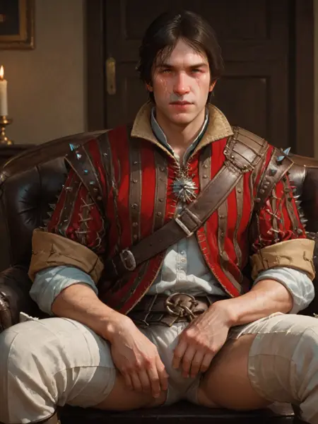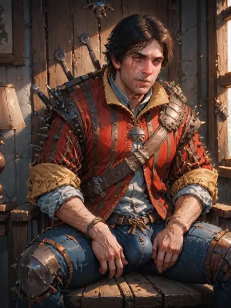 推奨TW: 1boy, male focus, solo, dark hair, middle part hair, light skin, scar, blood, yellow eyes, vertical slit pupils, brown and red striped spiked gambeson, yellow collar,