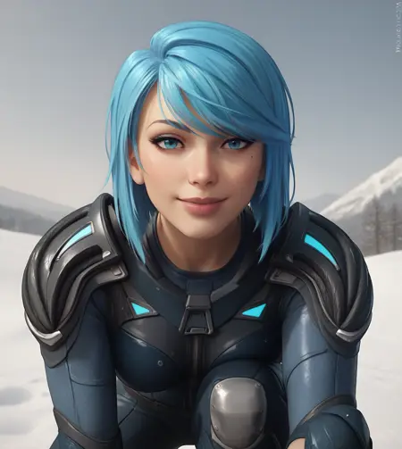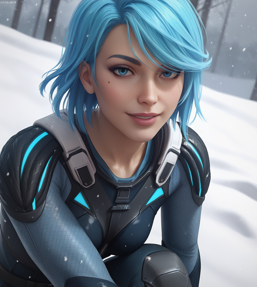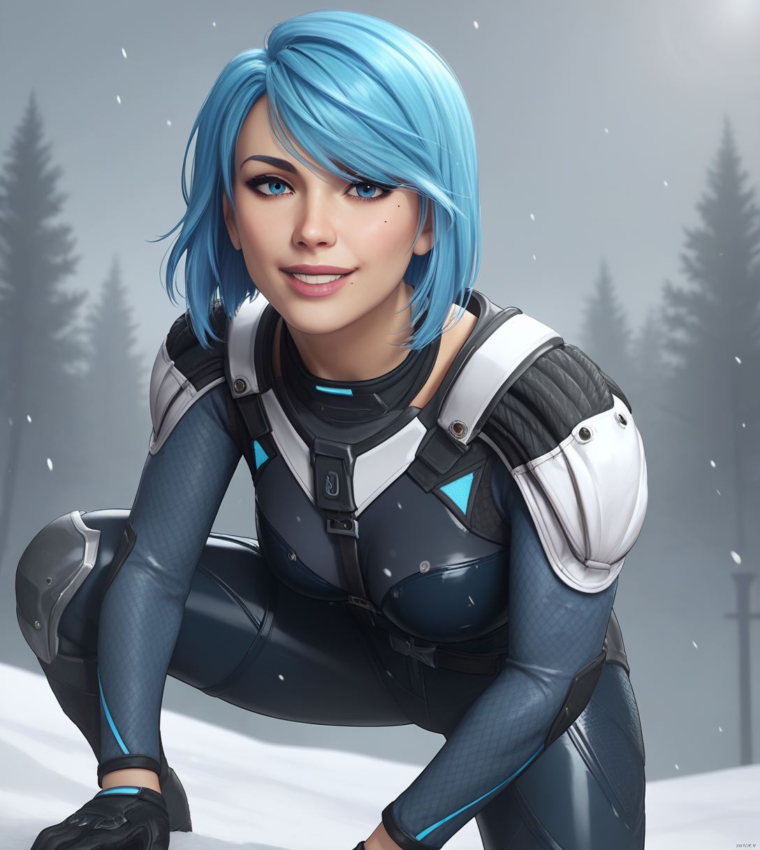 Nyx,一名女性,成熟面容,白皙皮肤,短蓝色头发,痣,蓝色头发,(蓝色眼睛),手套,连体衣,高科技,士兵,长裤