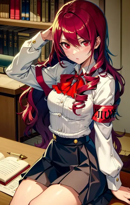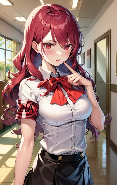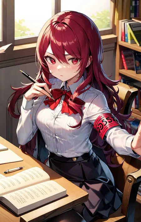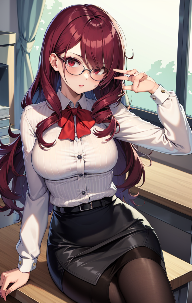 'Mitsuru Kirijo [Persona], gekkoukan high school uniform, white button up shirt, black skirt, chest bow, hair over on eye' - Example prompt for the normal outfit