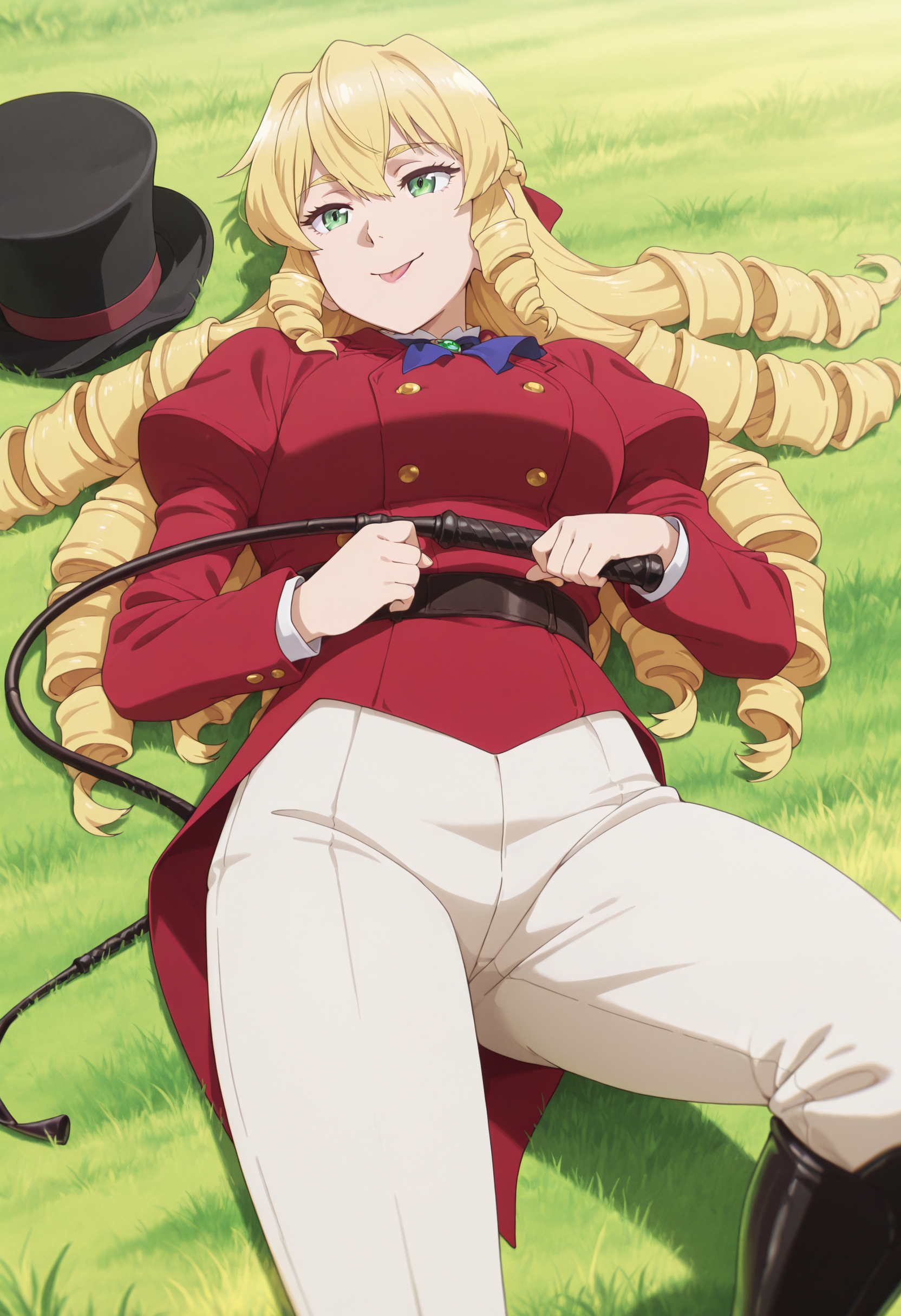 무릎 부츠, 검은 다리옷, 빨간 재킷, 흰 바지, 모자, 검은 모자, 들고 있는, 채찍, 빨간 리본, 헤어 리본,