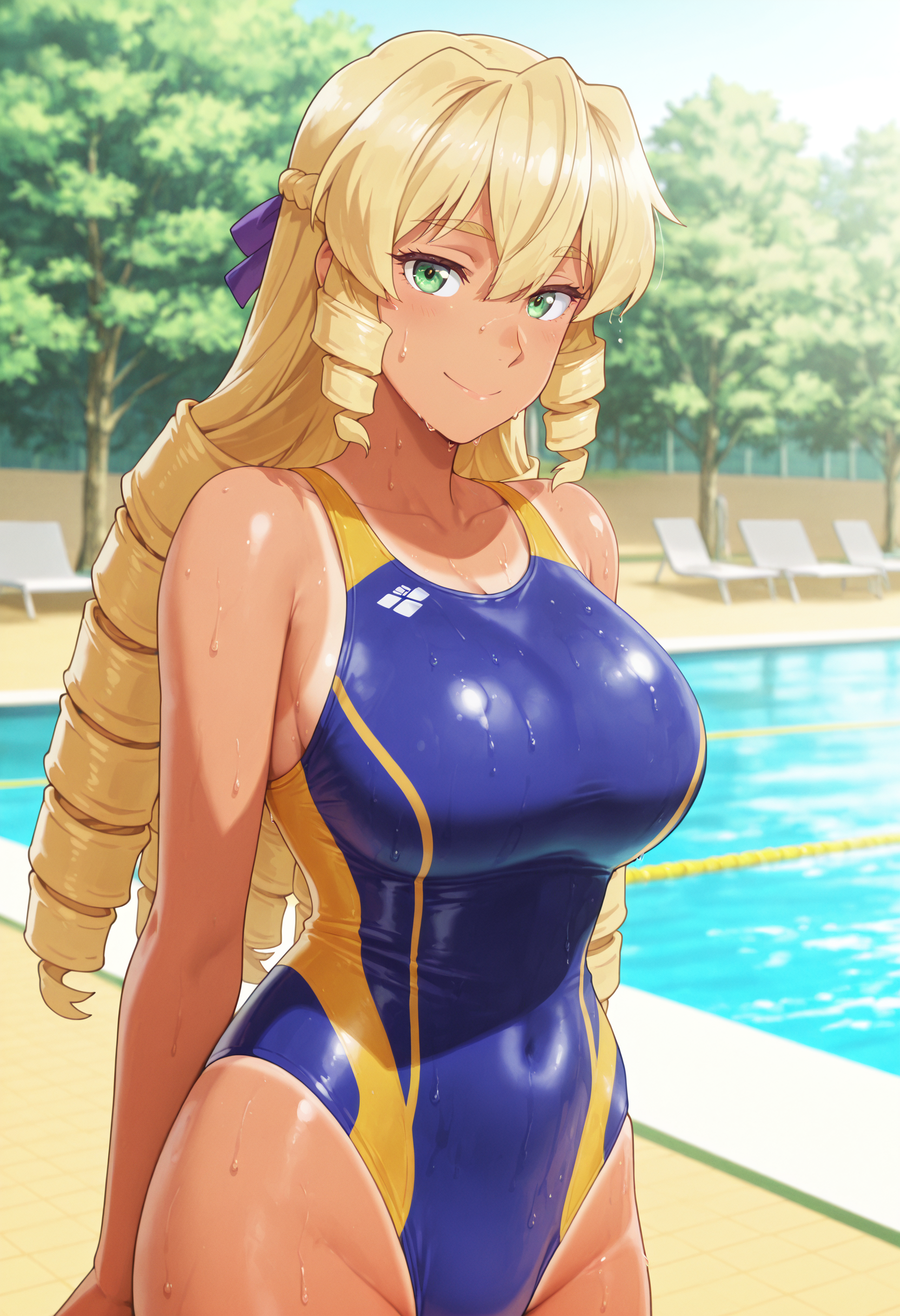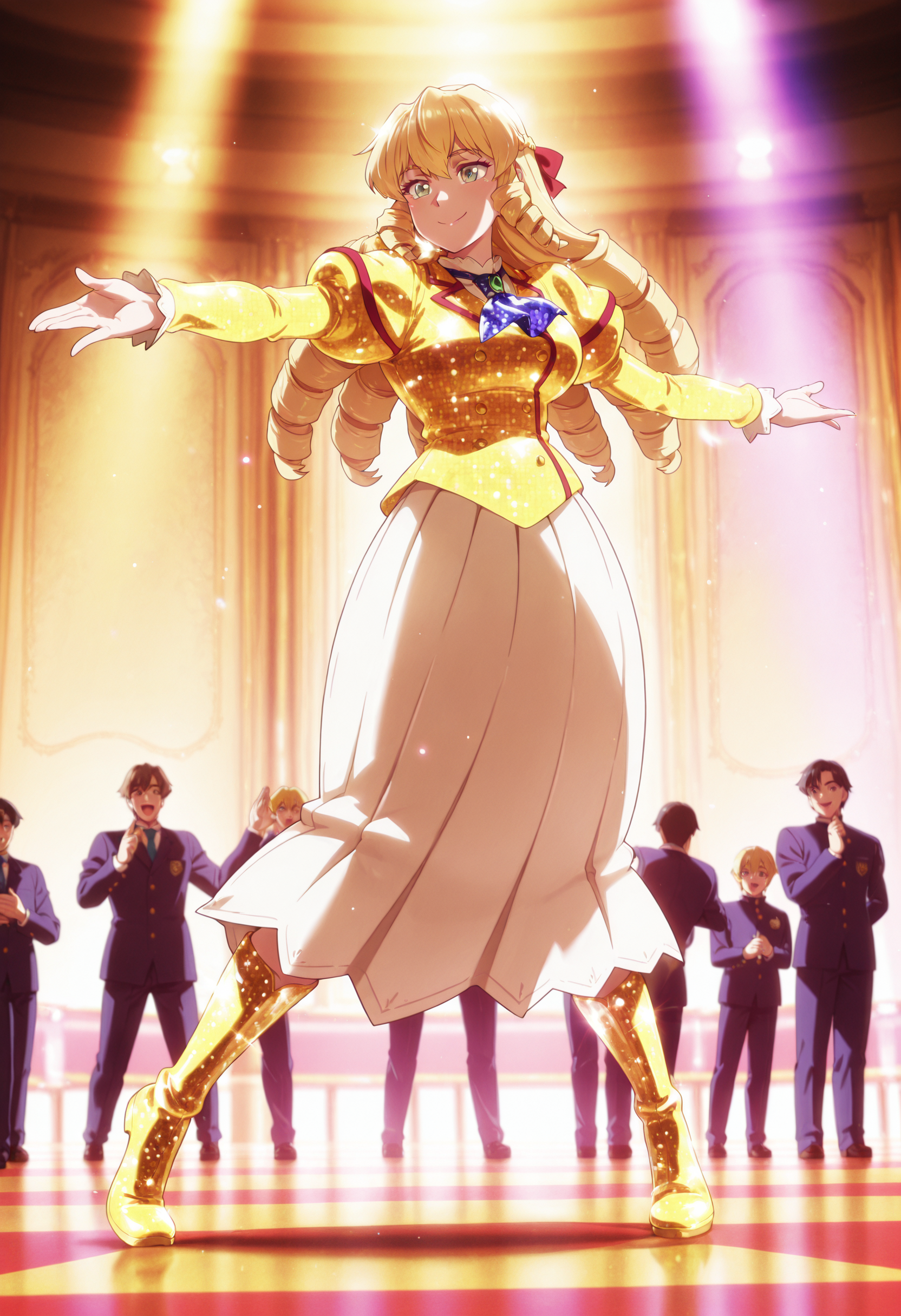 학교 유니폼, 헤어 리본, 빨간 리본, 반짝이는 애스콧, 보라색 애스콧, 녹색 브로치, 반짝이는 재킷, 노란 재킷, 긴 소매, 풍선 소매, 빨간 트림, 긴 치마, 흰 치마, 반짝이는 부츠, 노란 무릎 부츠,