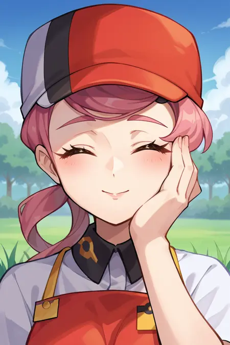 Key word is pkmncenternurse_sv and for default outfit use: pink hair, hat, black collar, white shirt, pokeball_apron, blue shorts, nametag, white shoes,