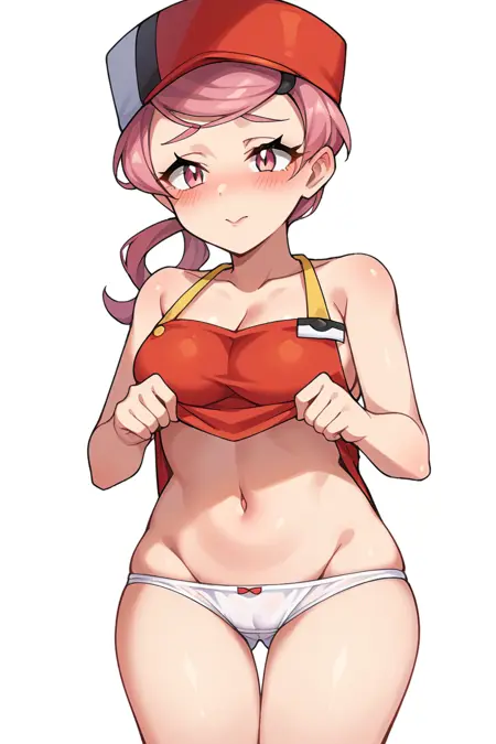 Key word is pkmncenternurse_sv and for default outfit use: pink hair, hat, black collar, white shirt, pokeball_apron, blue shorts, nametag, white shoes,