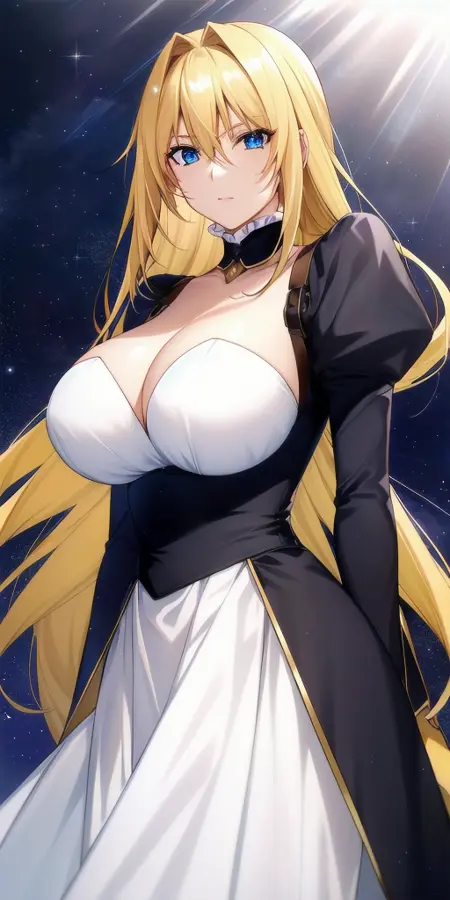 black_dress_white_dress_underbust_center_opening_juliet_sleeves_overskirt_frilled_choker_shoulder_strap: Her classic outfit.