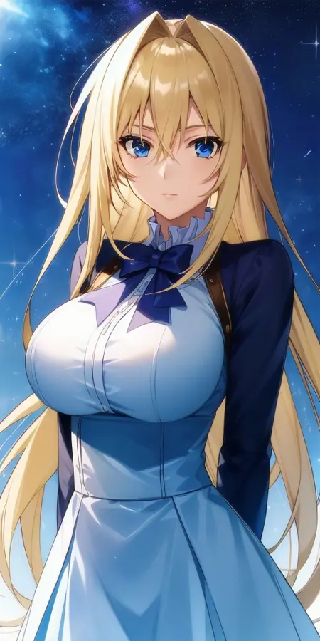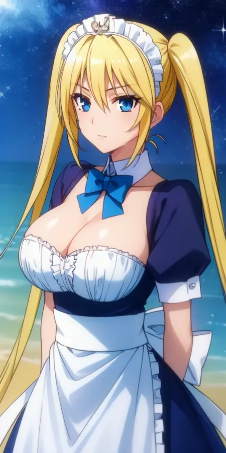 blue_short_dress_maid_headdress_detached_collar_waist_apron_blue_bowtie_puffy_short_sleeves_cleavage_white_back_bow: Her blue maid outfit.