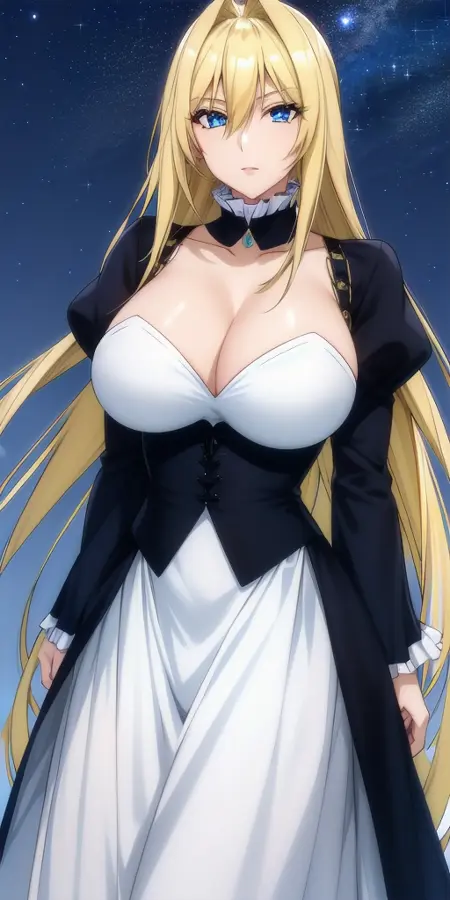 black_dress_white_dress_underbust_center_opening_juliet_sleeves_overskirt_frilled_choker_shoulder_strap:她的经典造型。