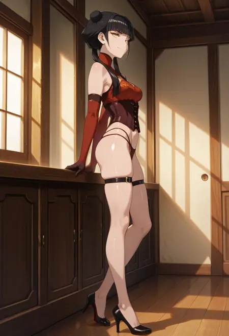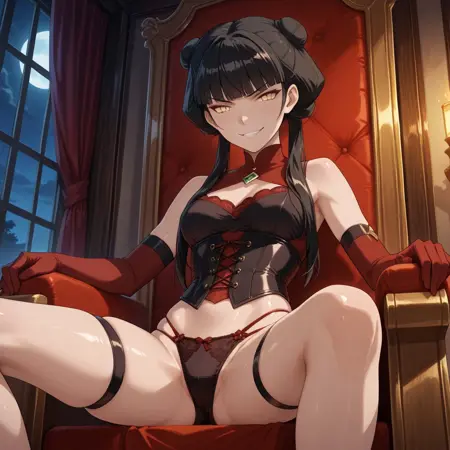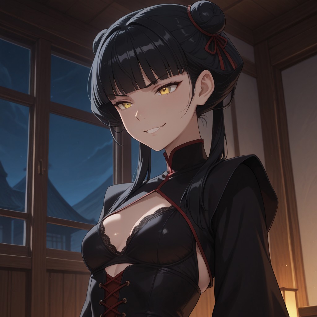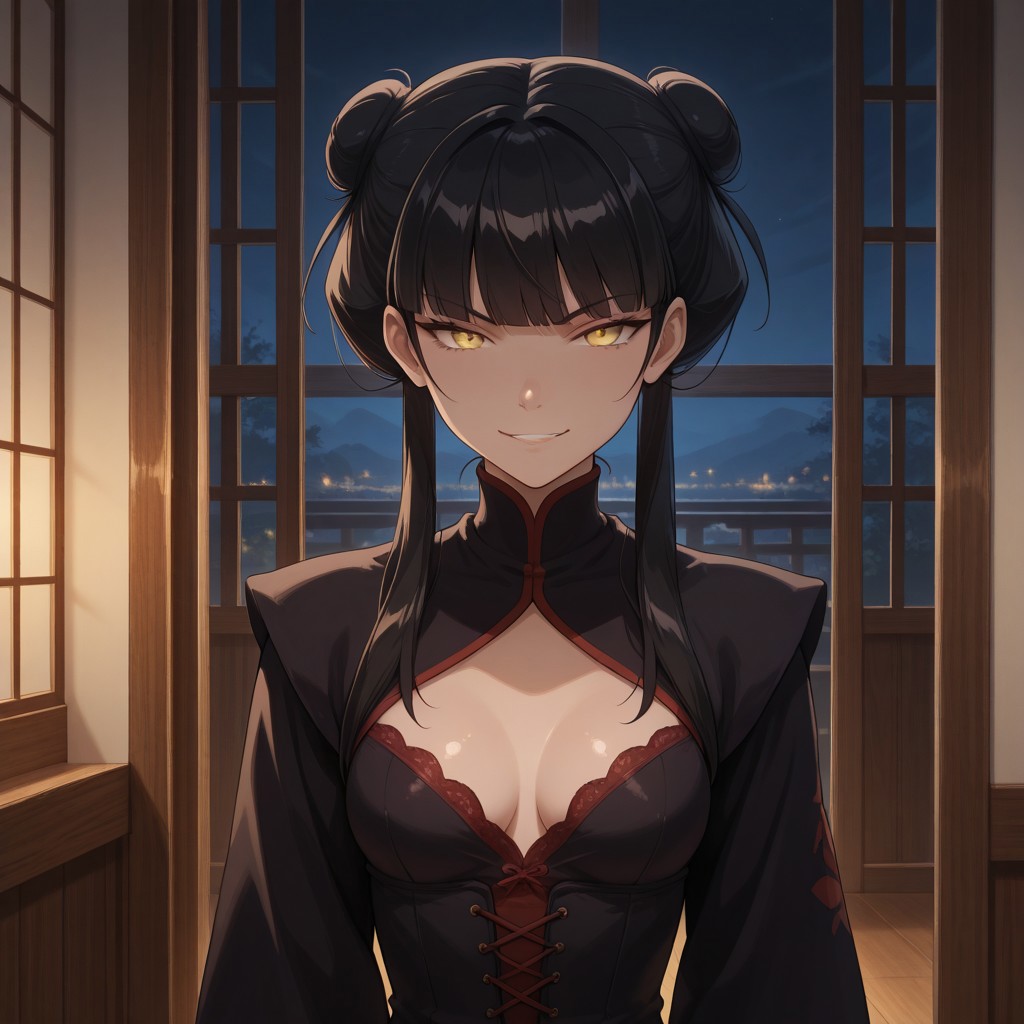 Mai_Avatar, black hair, long hair, blunt bangs, double hair bun, twintails, sidelocks, yellow eyes,