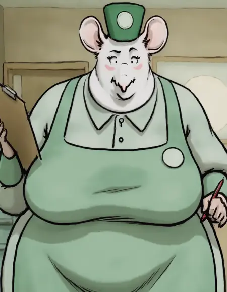 obese,female rat,green nurse outfit,green hat,white fur skin