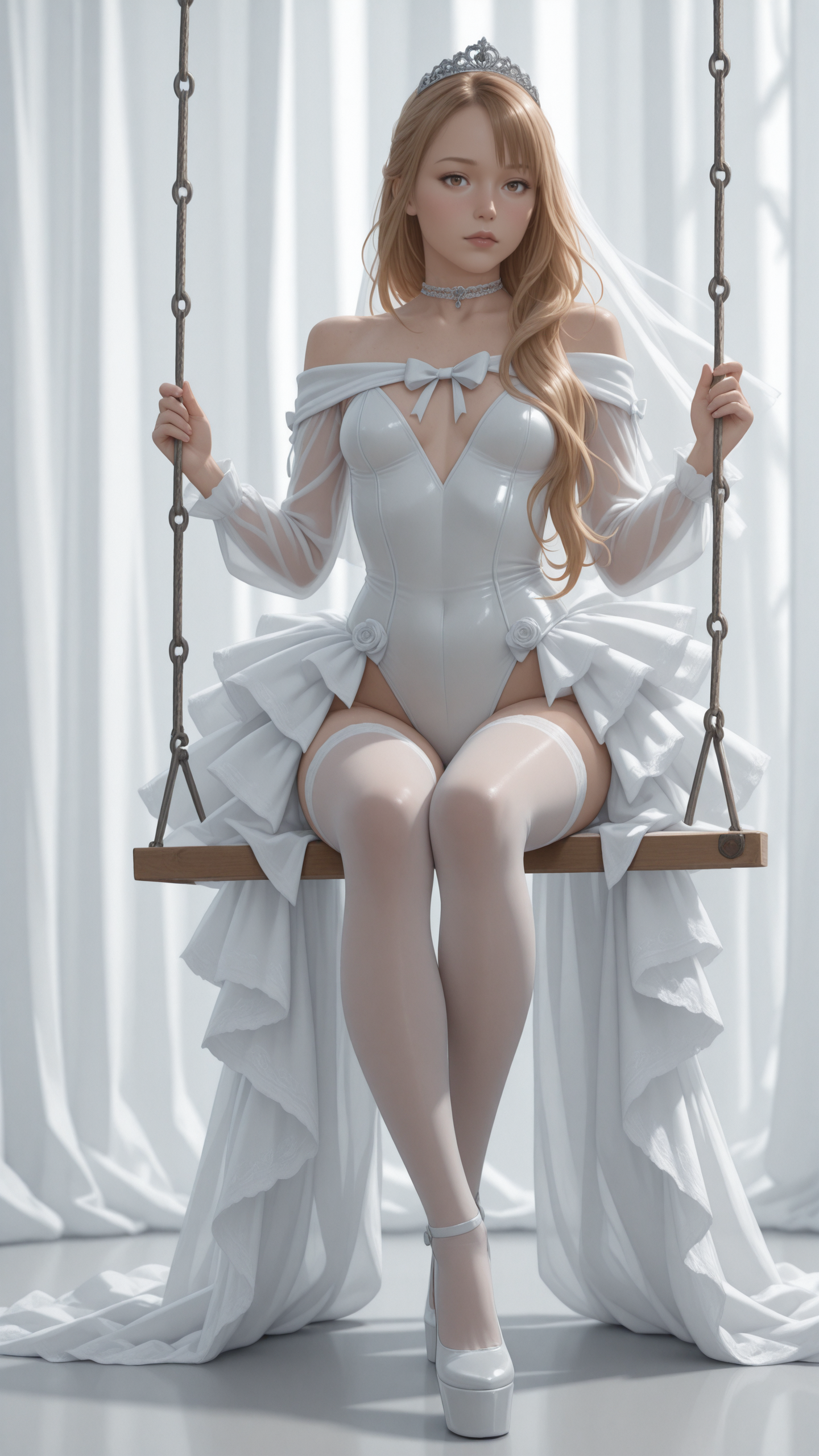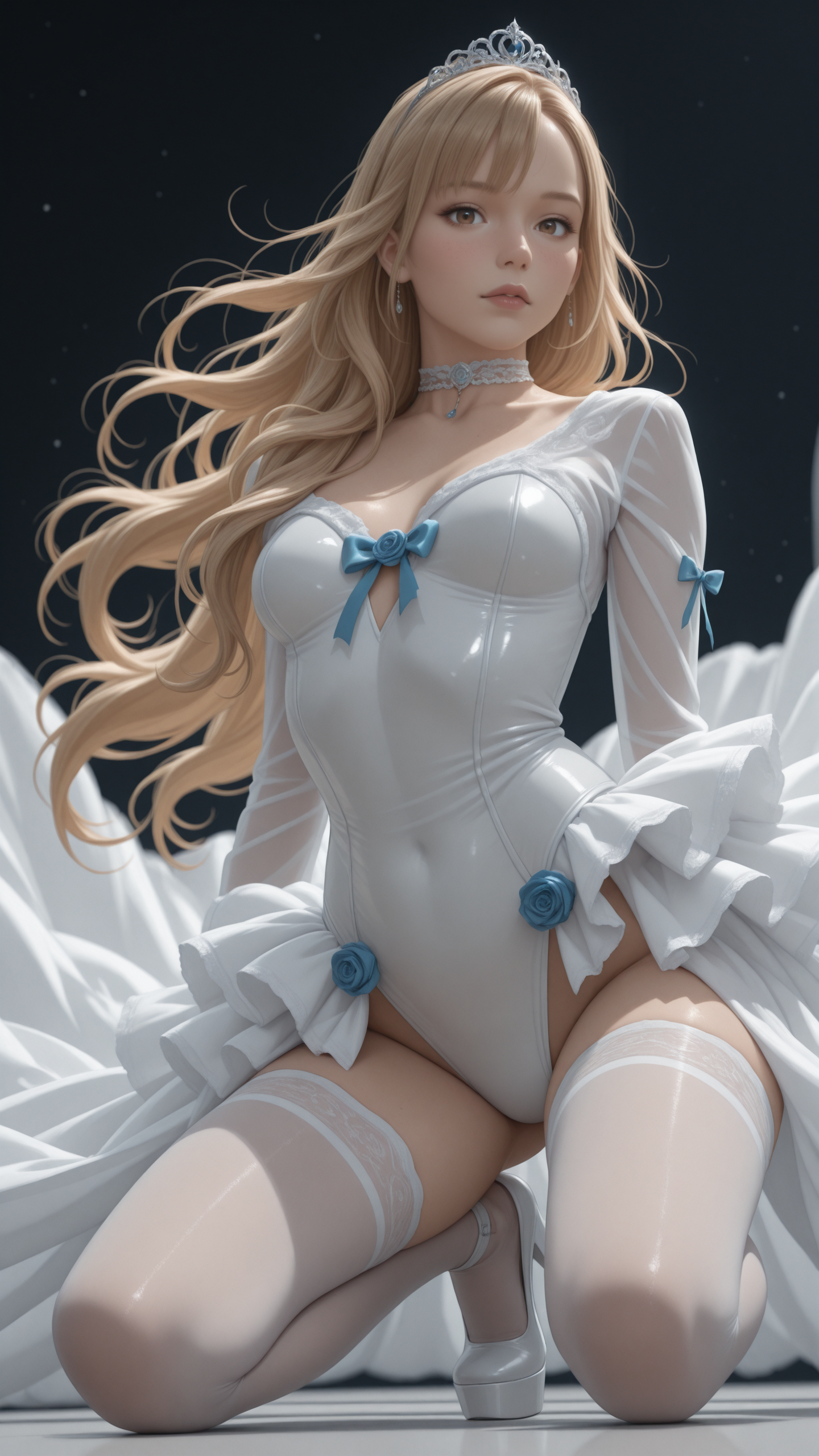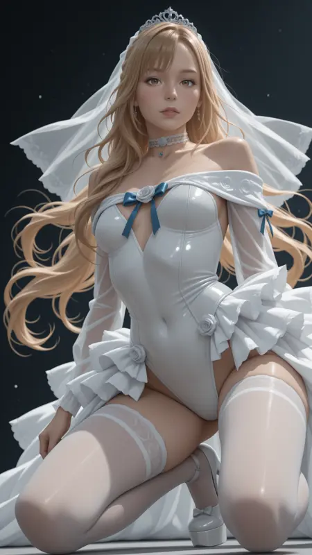 prly, white outfit, leotard, long ruffled skirt, long sleeves, ribbons, thigh highs, platform shoes, pearlchoker, tiara, veil, gloves,