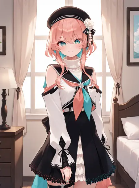 "HanagumoKuyuri, medium hair, hair ornament, turtleneck serafuku, black layered skirt,"