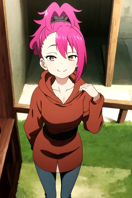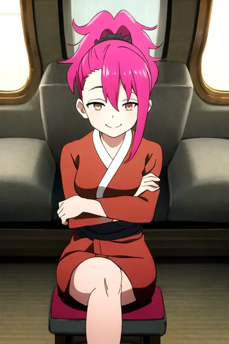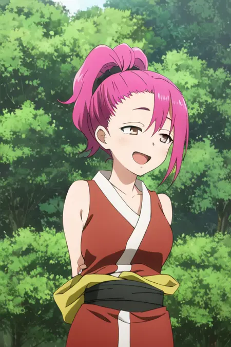kunoichiazami, brown eyes, pink hair, ponytail, red kimono, bandage