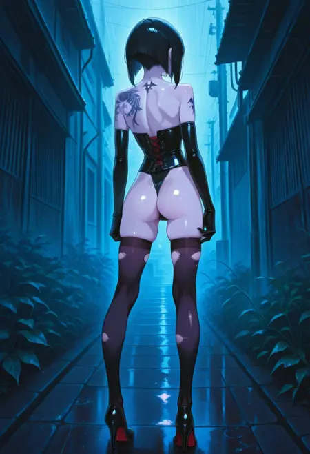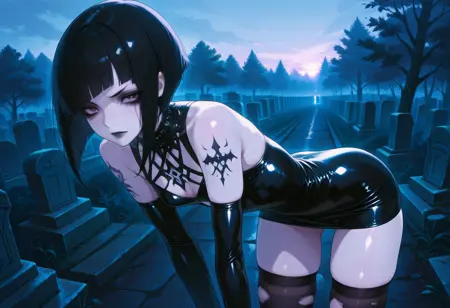SadisTrix、逆ボブヘア、黒髪、蒼い肌、細身、腕のタトゥー、化粧、黒い唇、小さな胸、ゴシック風、