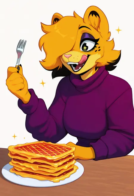 角色标签:兽耳女性、动物耳朵、动物鼻子、一缕头发遮住眼睛、橙色毛发、身体毛发、妆容、黄色毛发、短发、眼影、黑色眼睛、双色毛发、双色头发、雀斑、尾巴