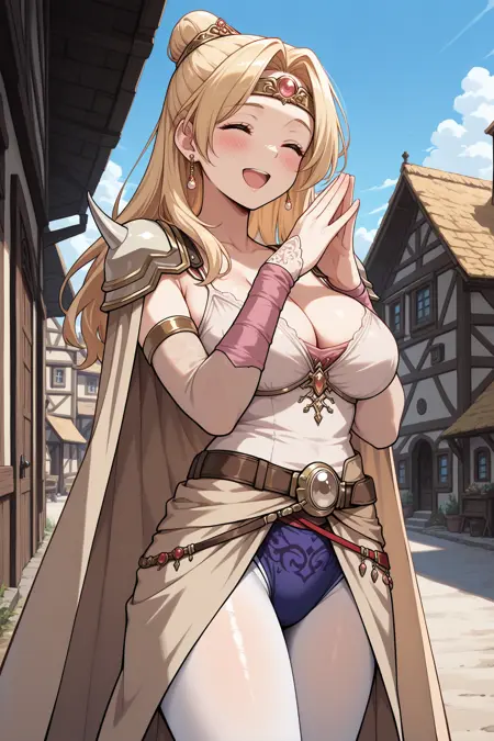그녀의 전형적인 외모를 위해 "** 귀걸이, 원형 관모, 베이지색 망토, 어깨 갑옷, 캄리솔, 보라색 버루마, 흉부 노출, 벨트, 허리 주변 옷, 투명한 소매, 흰색 팬티스타킹**"을 추가하세요.