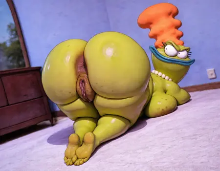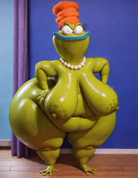 ,obese,female,frog,orange hair,blue lips,green skin,pink shirt,pearl necklace,blue pants,white high heels