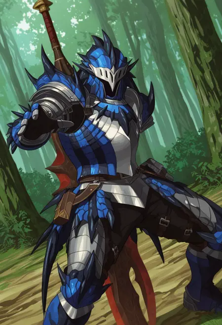 男性头盔在面部区域并非100%稳定,但其他部分表现良好!如需更改配色(例如苍蓝雷狼龙装甲),请使用“blue armor”或类似关键词。