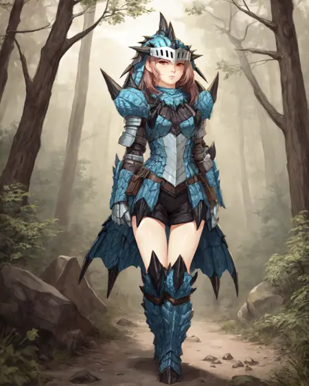 男性头盔在面部区域并非100%稳定,但其他部分表现良好!如需更改配色(例如苍蓝雷狼龙装甲),请使用“blue armor”或类似关键词。