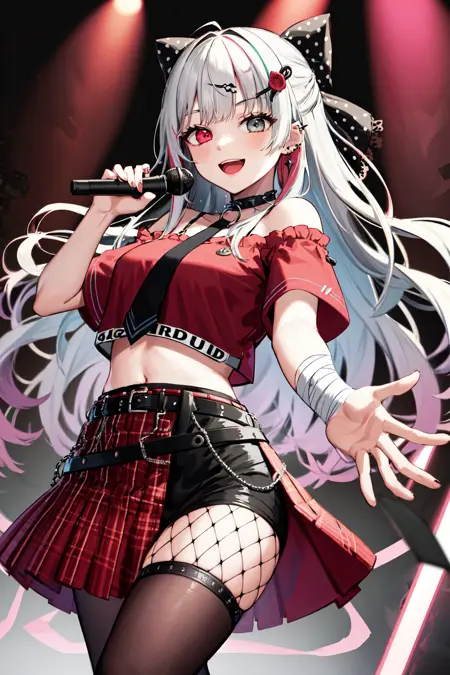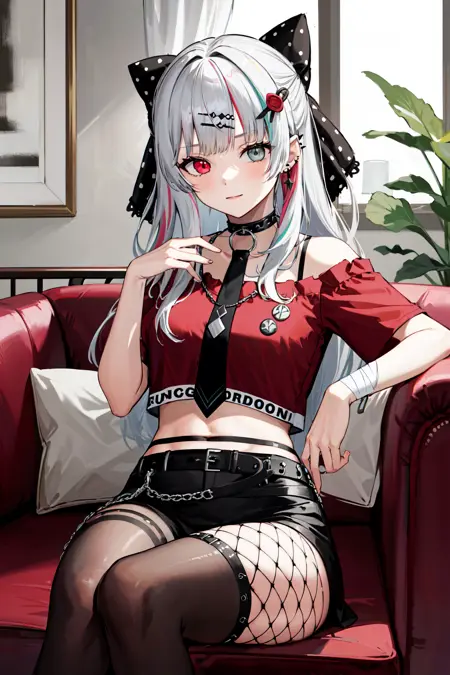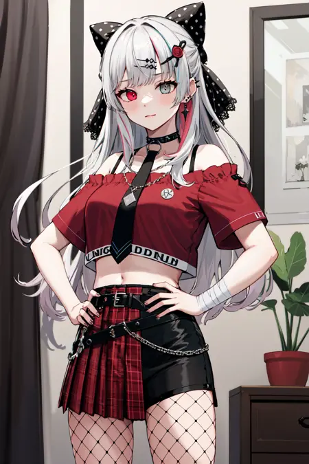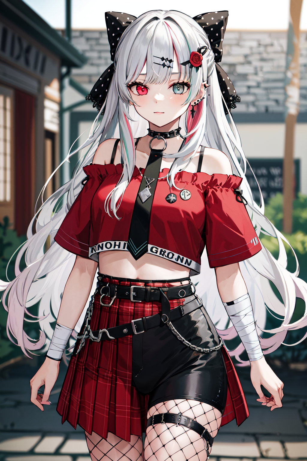 아우트핏1aanozomi, 긴 머리, 스트라이프 머리, 머리 장식, 머리 리본, 폴카닷, 머리 꽃, 귀 piercing, 귀걸이, 이채색 눈, 어깨 노출, 초커, 넥타이, 빨간 셔츠, 단소매, 붕대, 허리, 검은 벨트, 플레드 치마, 빨간 치마, 검은 쇼츠, 체인, 허벅지 스트랩, 피쉬넷 팬티스타킹